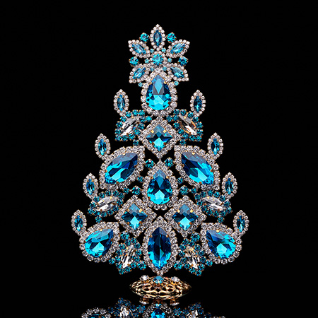 Festive Czech rhinestones Christmas tree adorned with handcrafted ornaments featuring aqua blue rhinestones. It is decorated with candles and beautifully crowned with an impressive star.