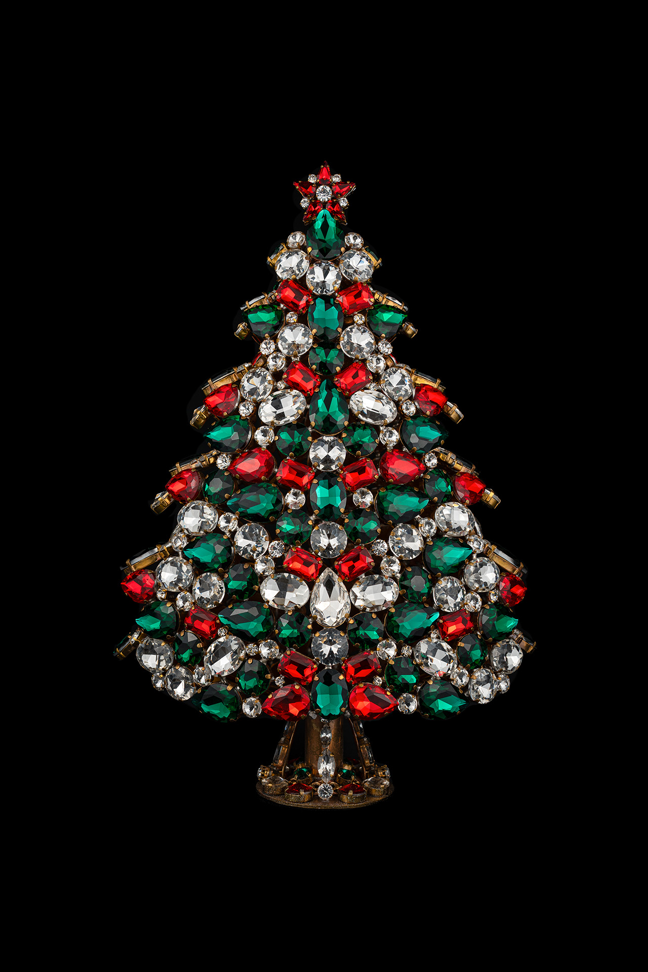 Festive 3D table top Christmas tree, hand crafted with perfectly cut Clear, Emerald, and LT Siam colored Czech rhinestone crystals making this magical Christmas tree a truly beautiful gift to add to your collection. A masterpiece from any angle.