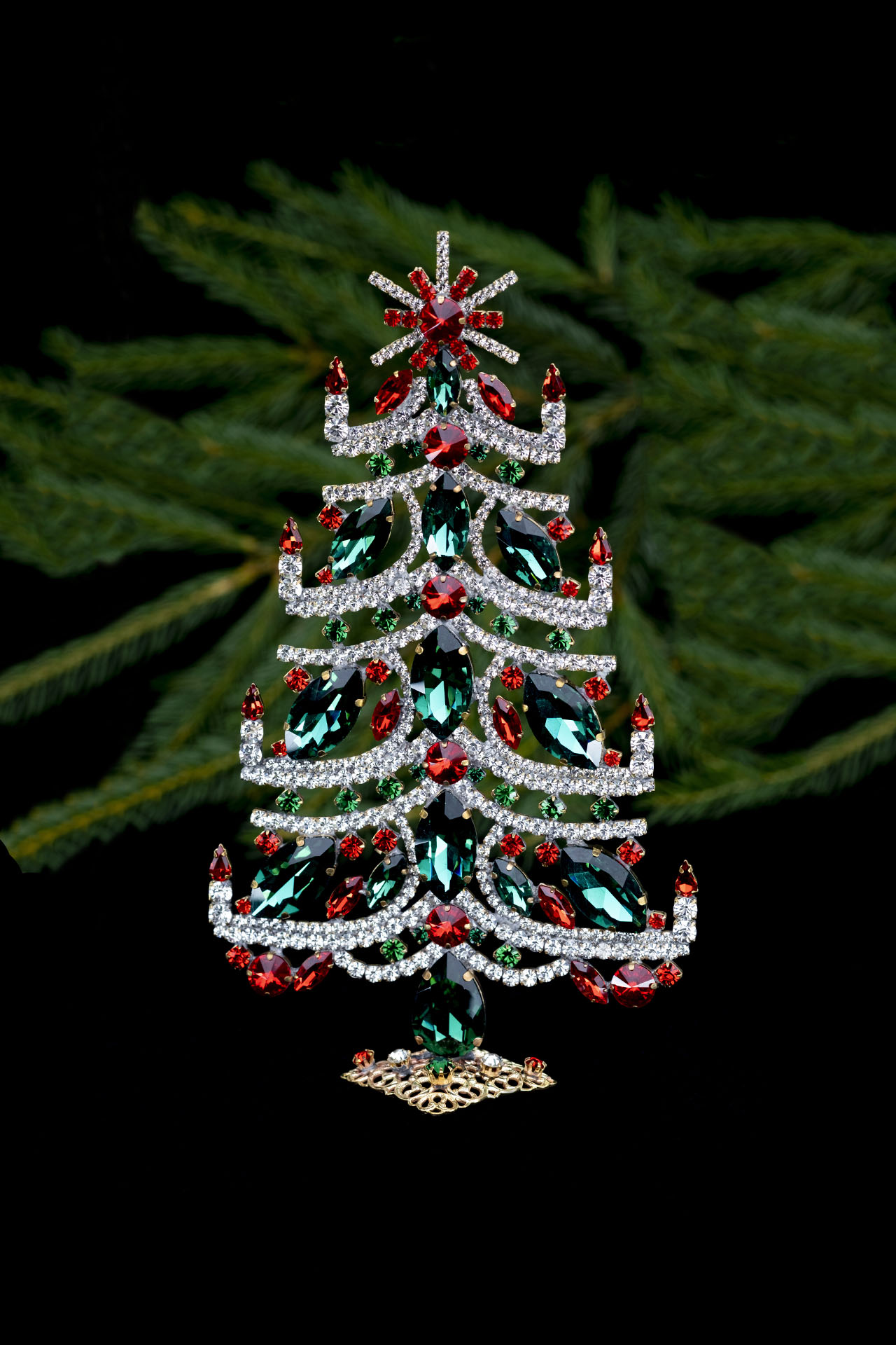 Bethlehem table top Christmas tree, handcrafted with Clear, LT Siam and Emerald colored Czech rhinestone crystals cut into different glass ornament decorations such as a Bethlehem style Christmas star, perfectly placed crystals to look like tinsel and finished off with 8 flamed candles.