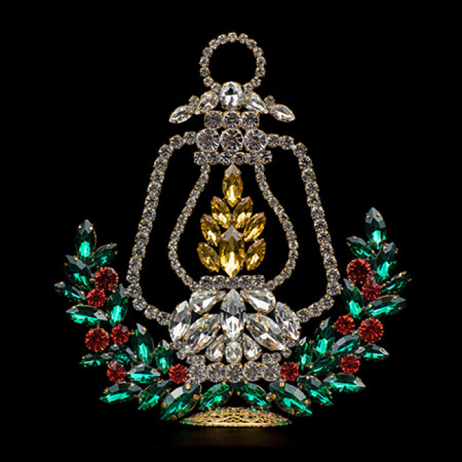 This crystal Bethlehem Light lantern is a symbolic decorative masterpiece, inspired by the tradition of light as a sign of hope and peace. Clear and golden crystals are accented with deep green and rich red tones, reminiscent of evergreen branches and timeless Christmas colors. Together, they create a refined and festive presence, radiating warmth, renewal, and the enduring spirit of the season. Designed as a visual symbol, this piece brings meaning, harmony, and sophisticated seasonal beauty to elegant interiors and holiday displays.