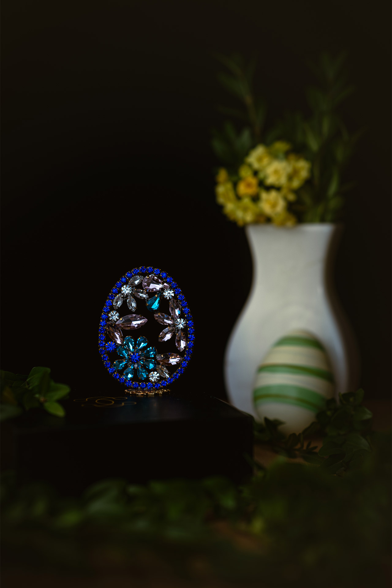 Fancy floral Easter egg made from Clear, Aqua and Sapphire colored rhinestone crystals. It is beautifully decorated with perfectly cut crystals pieced together with fine detail to make a bouquet of flower prints on the Easter egg. A bouquet of love to keep forever.