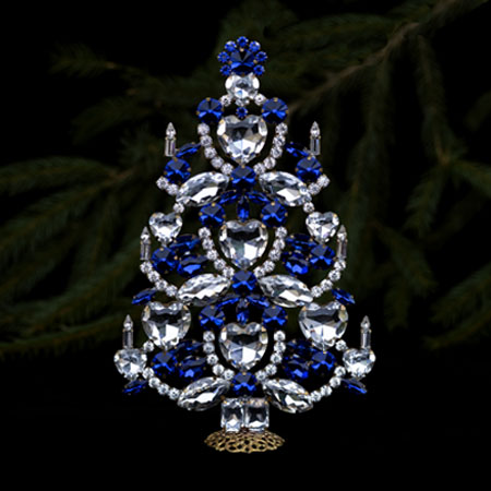 The table top Christmas tree has been handcrafted with Clear and Sapphire rhinestone crystal ornament decorations.